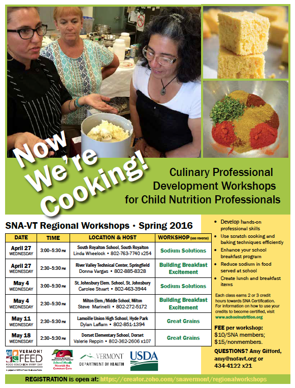 That's why VT FEED partners every year on a series of culinary professional development workshops for child nutirition professionals: Now We're Cooking. Along with the School Nutrition Association of Vermont, New Enland Culinary Institute, Vermont Department of Health, and USDA, we are proud to help produce these hands-on cooking sessions that support staff in cooking healthier dishes that meet school food guidelines AND student approval. Topics range from cooking lower sodium meals and using whole grains to building exciting breakfast programs.